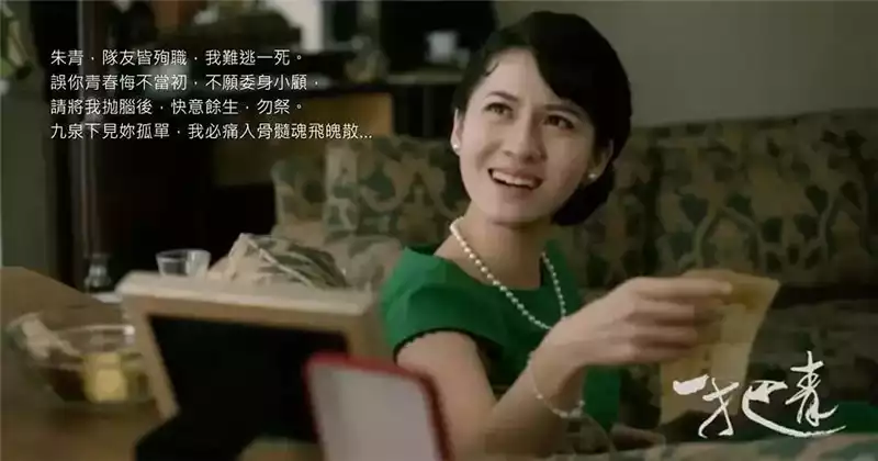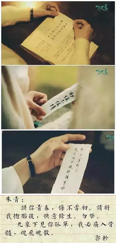 朱青收到了郭轸给她的遗书:“朱青,队友皆殉职,我难逃一死。误你青春悔不当初,不愿委身小顾,请将我抛脑后,快意余生,勿祭,九泉下见你孤单,我必痛入骨髓,魂飞魄散。”