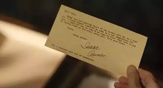 此时镜头对准c.w.苍老的面容,在他微笑的脸上同时充满着疲惫、希望、困惑、惊奇等多种情绪。距离他的预言已经过去了40多年,他也没能成为任何成功的科幻人物,然而还是有人来找他,因为喜欢他的所有作品,不仅仅是那本阿西莫夫代笔的书,还有他自己的书。