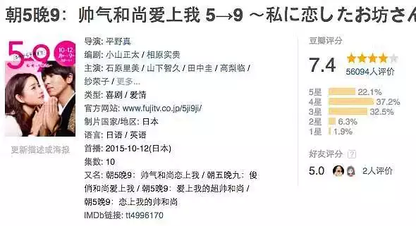 想想有演技过硬的石原里美、山下智久主演月九的“超人气大作”《朝五晚九~帅气和尚爱上我》在豆瓣上的评分也不过 7.4 而已 ▼