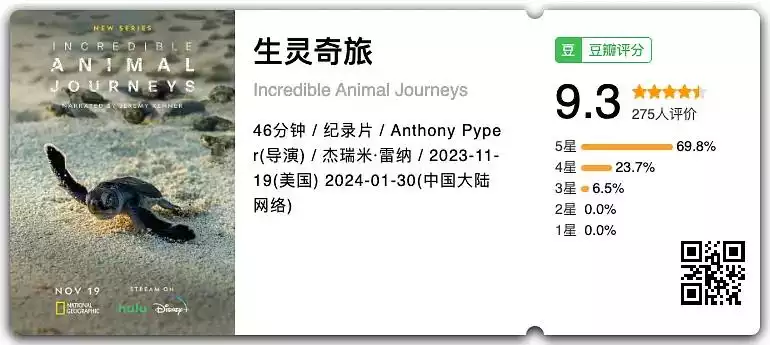 而作为观众的我们,不仅能通过这部纪录片看到动物们所历经的各种艰难险阻,同时也能体验到自然的馈赠和残酷。